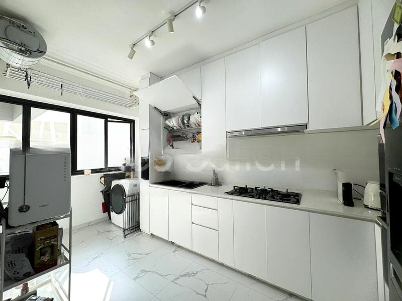 Step into this beautifully renovated HDB flat and be greeted by an abundance of natural light that floods the open living space, accentuating the modern minimalist design. The marble-look floor tiles and designer chandeliers create an elegant ambiance, while the glass-enclosed study offers a perfect blend of functionality and style, making it an ideal workspace.