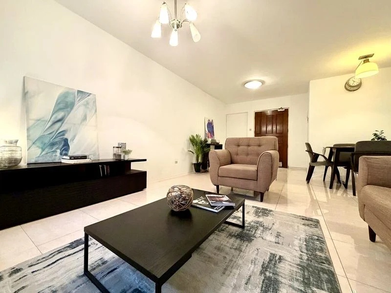 This well-maintained flat features a thoughtful layout with two bedrooms, including a master bedroom showcasing a mirrored sliding wardrobe and stylish patterned wallpaper. The living room boasts tiled flooring and a designated dining area, making it ideal for entertaining. Enjoy the convenience of a fully-furnished home, ready for you to move in and make it your own.