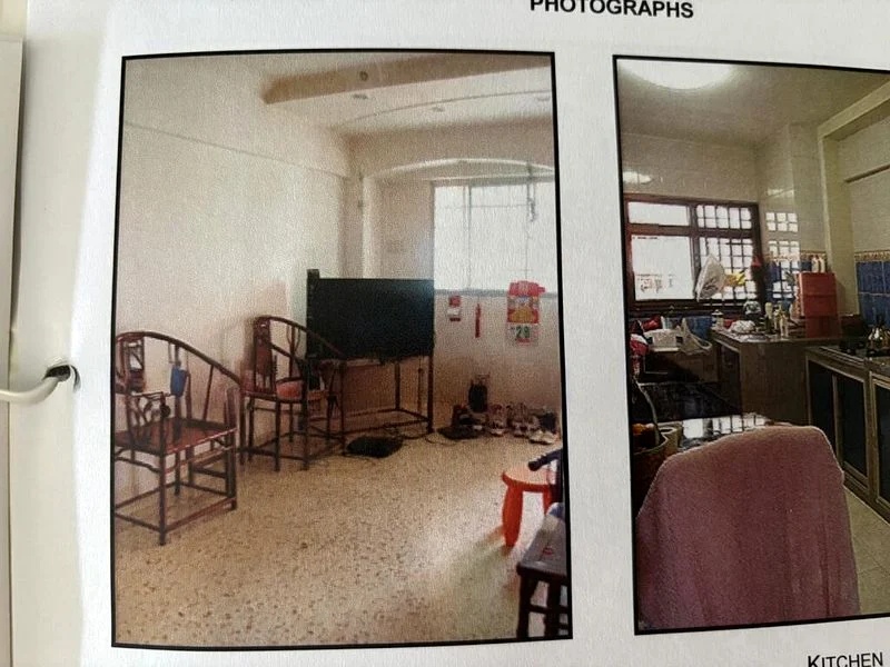 Step into a world of nostalgia as you enter this charming HDB flat, where the original terrazzo flooring and wave-patterned false ceiling create a warm, inviting ambiance. Natural light filters through the windows, illuminating the traditional features, including a built-in red altar and a unique glass block wall partition that adds character to the living space.