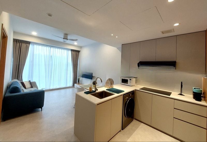 Step into a bright and airy sanctuary at CityVista Residences, where abundant natural light floods the open-plan living and dining area through floor-to-ceiling glass doors. The modern architecture and lush greenery views create an inviting ambiance, perfect for relaxation or entertaining. The spacious balcony, adorned with wood-look decking and a ceiling fan, offers a seamless extension of your living space, ideal for enjoying the city skyline.