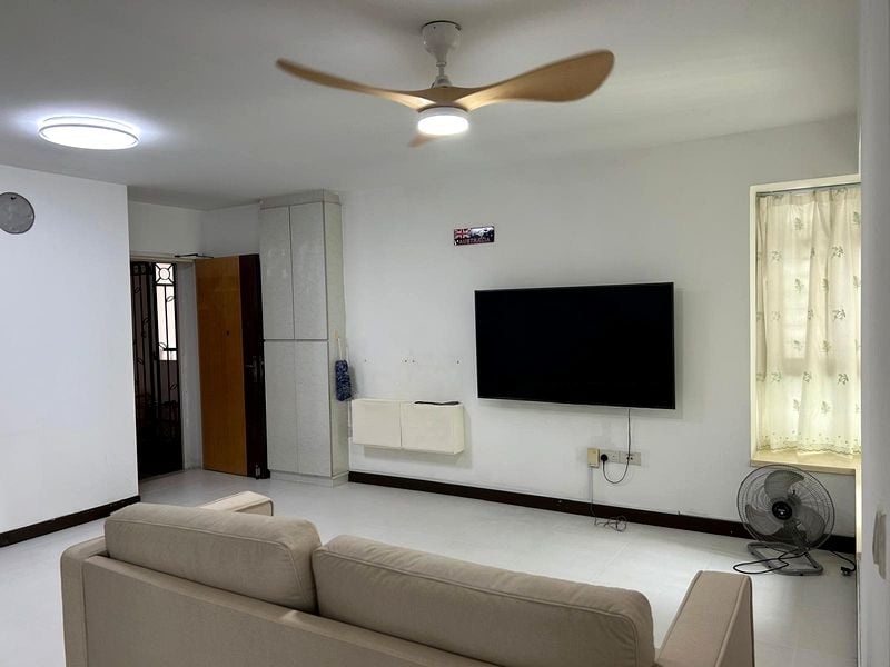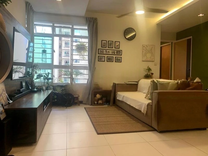 Step into this inviting 4-room HDB unit, where a split-level living and dining area greets you with its warm wood-look flooring and a stylish wallpapered feature wall. Natural light filters through large windows, creating a cozy ambiance that feels both lived-in and welcoming. Enjoy urban landscape views from your living space, making it a perfect retreat after a long day.