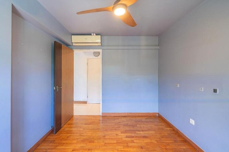 This thoughtfully designed unit features three well-appointed bedrooms, including a master bedroom with elegant parquet flooring, cove lighting, and a built-in desk area perfect for work or study. The second bedroom boasts a clever bunk bed with integrated storage, ideal for maximising space. The entryway is equipped with built-in storage cabinets, ensuring a clutter-free environment.