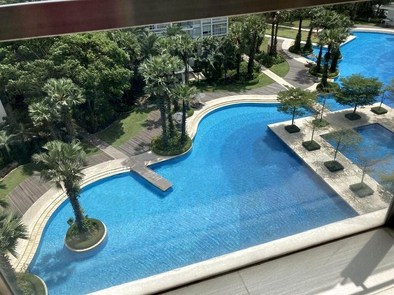 Step into a world of elegance and comfort as you enter this beautifully maintained unit at The Sea View. Bathed in natural light, the open-concept living and dining area features floor-to-ceiling windows that frame stunning views of the city skyline and lush greenery. The ambiance is bright and airy, enhanced by a ceiling fan and split-unit air conditioning, making it the perfect space for relaxation or entertaining.