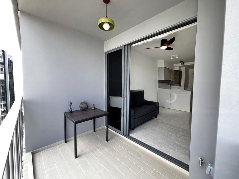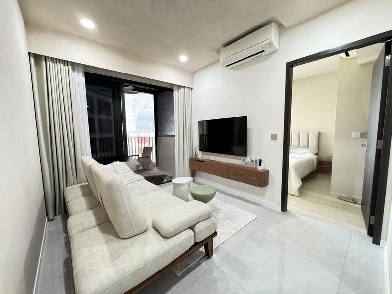 Step into a beautifully renovated unit at The Florence Residences, where modern minimalist design meets urban living. The open-concept living room welcomes you with large format grey floor tiles and a neutral colour palette, complemented by natural light filtering through sliding glass doors. Enjoy the ambiance created by track lighting and a ceiling fan, making this space perfect for relaxation or entertaining.