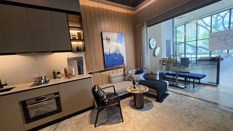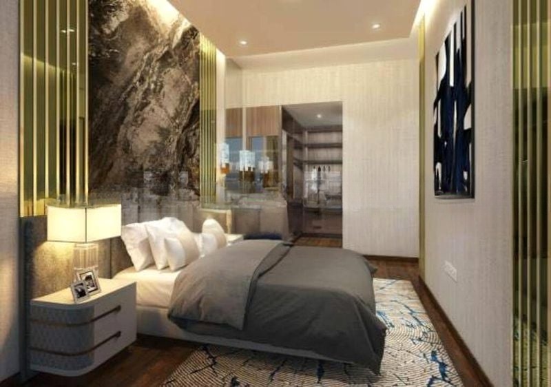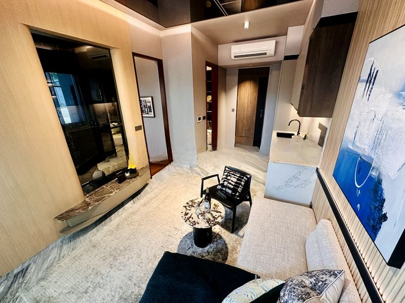 This efficient 2-bedroom layout features an en-suite master bedroom adorned with a stylish headboard paneling and a walk-in closet that boasts integrated lighting. The second bedroom offers a cozy retreat with large windows and modern furnishings. The bathrooms are a sanctuary of luxury, featuring a rain shower and marble-look wall tiles that elevate your daily routine. With a high-volume void over the living and dining areas, the space feels even more expansive and airy.