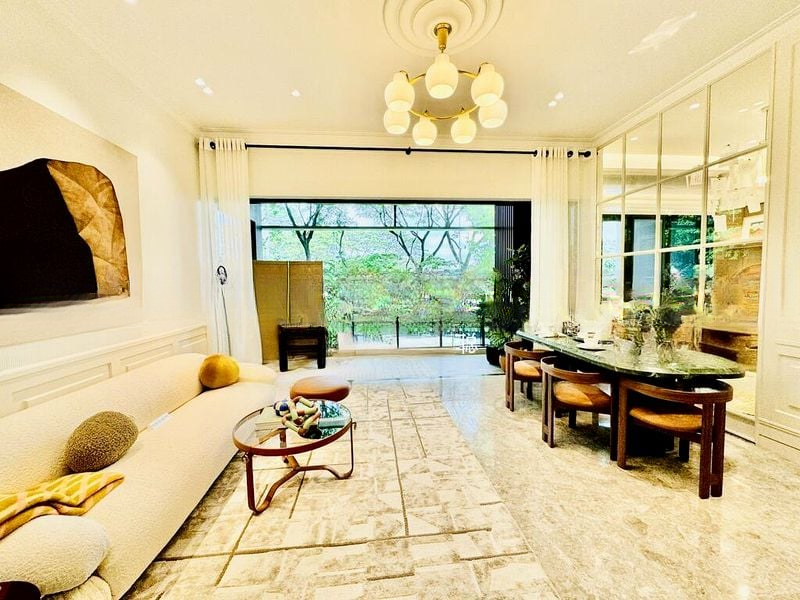 This well-maintained 3-bedroom, 3-bathroom unit features an open-concept living and dining area adorned with designer lighting fixtures and a stunning chandelier. The galley kitchen is a chef's dream, boasting marble countertops, integrated appliances, and sleek cabinetry. Each bedroom offers a unique touch, from the landscape-themed wallpaper in the master to the mirrored wall panels in the second bedroom, ensuring comfort and style throughout.