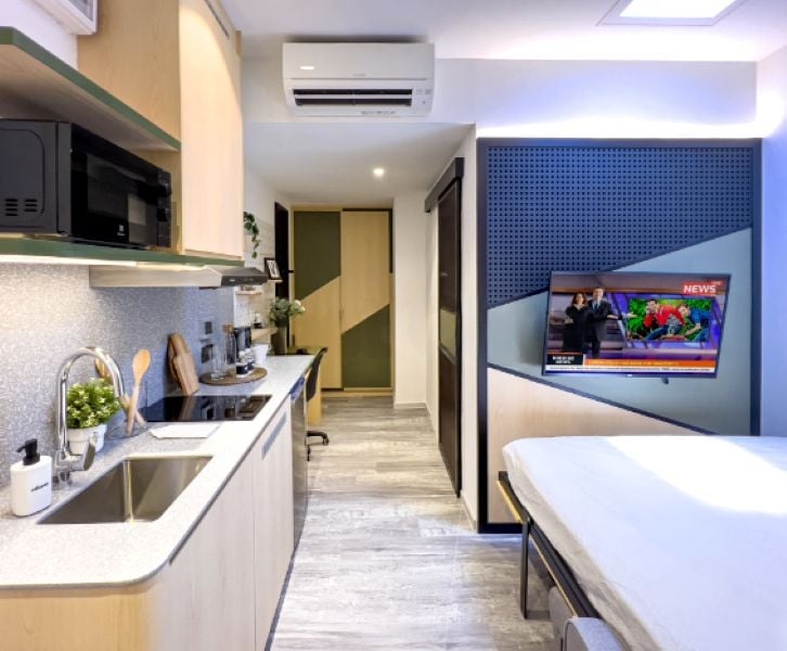 Step into a world of modern elegance as you enter this beautifully renovated unit at Coliwoo Balestier 320. The airy living area, adorned with light wood-look flooring, invites natural light to dance across the space, highlighting the chic grey fabric sofa and height-adjustable coffee table. Enjoy captivating views of heritage shophouses and the vibrant city street from your window, creating a perfect backdrop for relaxation.