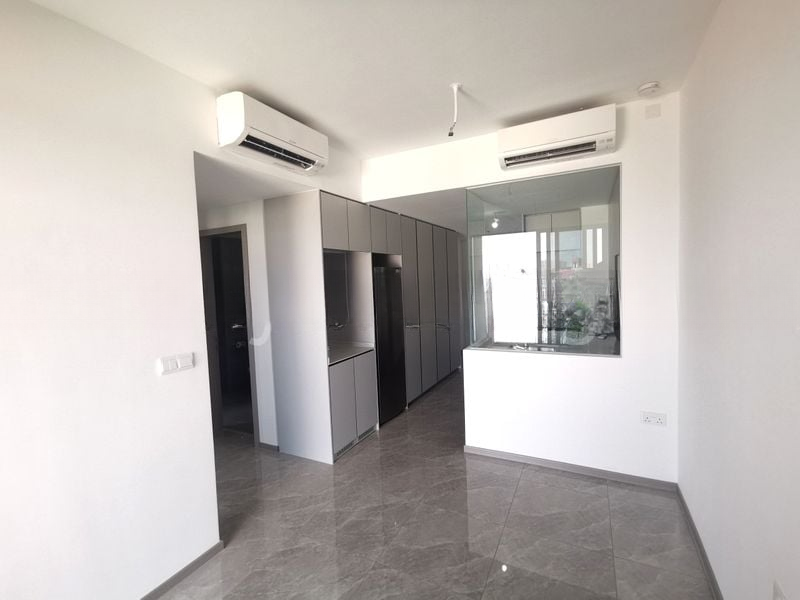 Step into a beautifully maintained unit at The Garden Residences, where modern finishes and natural light create an inviting ambiance. The mint green walls and large format grey tiles in the living room enhance the spacious feel, while the balcony offers a serene view of the tennis court and landscaped courtyard, perfect for relaxation.