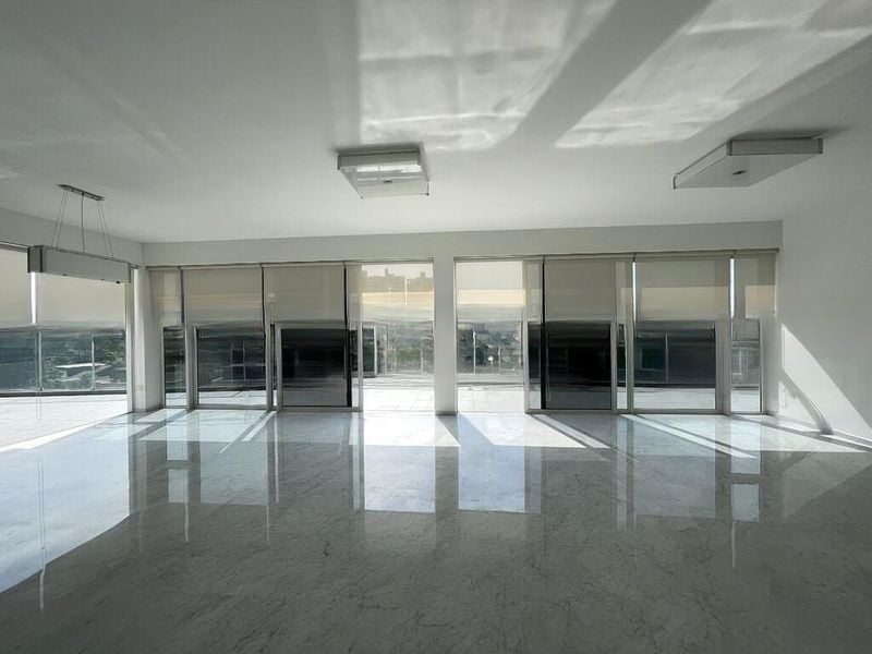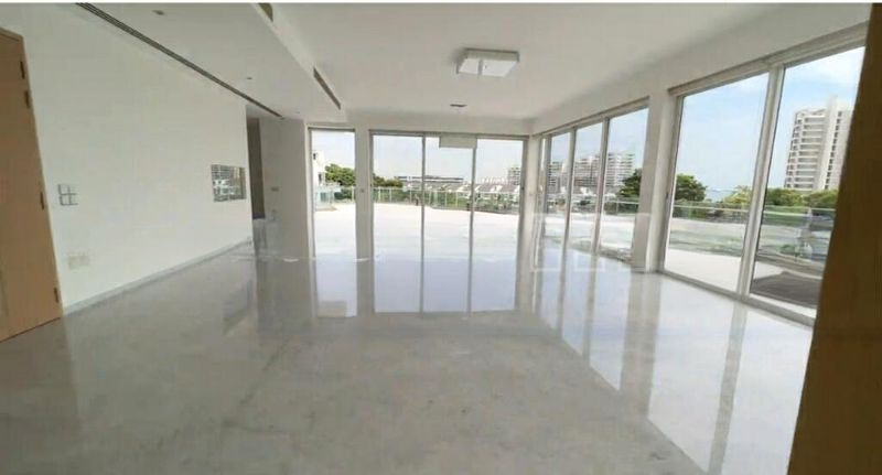 Step into a world of luxury as you enter this stunning 5-bedroom 'Sky Villa' duplex at Turquoise. Bathed in abundant natural light, the open-concept living and dining area features polished marble flooring and floor-to-ceiling glass doors that frame panoramic views of the waterway, lush greenery, and the skyline. The ambiance is bright and airy, inviting you to relax and unwind in this exquisite space.