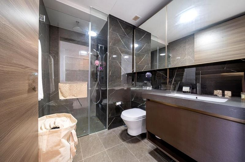 This 1-bedroom condo features a well-designed layout, showcasing standout elements such as an L-shaped kitchen with stone countertops and integrated oven, perfect for culinary enthusiasts. The bedroom boasts a built-in wardrobe with a mirror, complemented by wood-look flooring and a large window that enhances the serene atmosphere. The bathroom is a luxurious retreat, featuring dark marble-look wall tiles, a rain shower, and modern vanity with mirror cabinets.