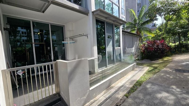 Step into a bright and airy sanctuary at Canberra Residences, where abundant natural light floods the space through floor-to-ceiling glass doors. The inviting ambiance is complemented by views of lush greenery and a beautifully landscaped path, creating a serene escape right at your doorstep.