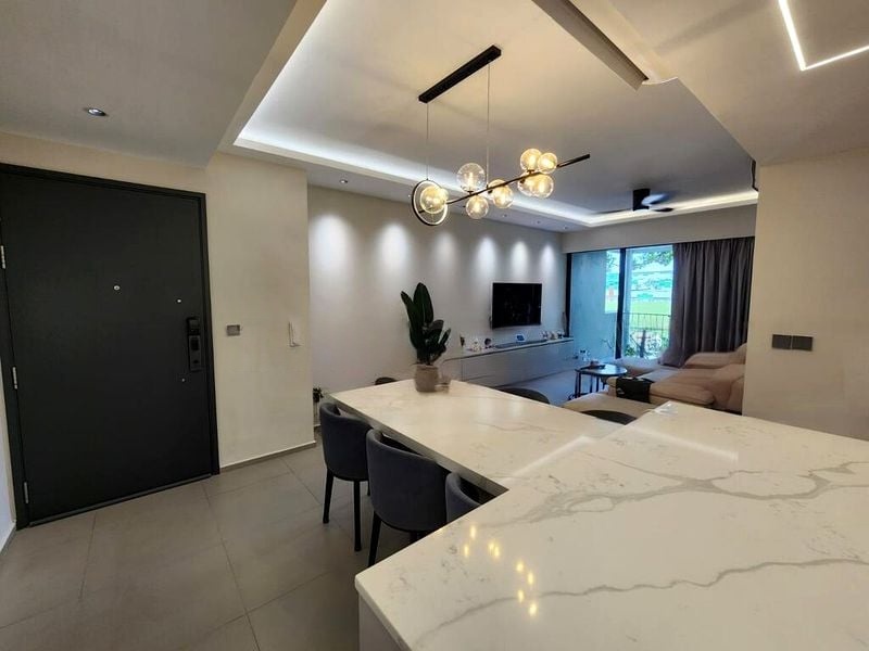 Step into a sanctuary of modern elegance where abundant natural light floods through floor-to-ceiling glass doors, illuminating the open-concept living and dining area. The seamless blend of marble-look quartz countertops and designer pendant lighting creates a sophisticated ambiance, while views of lush greenery from your exceptionally long Private Enclosed Space (PES) invite tranquility into your daily life.