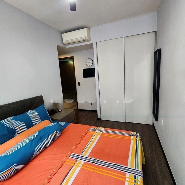 This well-maintained 3-bedroom, 2-bathroom unit features an efficient layout, perfect for families. The open-plan kitchen boasts white upper cabinets paired with dark wood-grain lower cabinets, complemented by sleek white countertops and integrated appliances. Each bedroom is equipped with ceiling fans and large windows, ensuring comfort and tranquility, while the master bedroom includes an en-suite bathroom with elegant marble-patterned tiles.