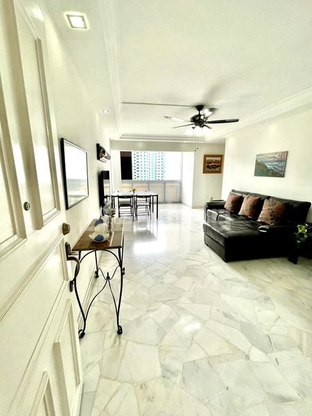 Step into a serene oasis where cozy living meets scenic beauty. This well-maintained 3-bedroom flat welcomes you with moderate natural light that dances across the polished tile flooring, highlighting the inviting ambiance. Enjoy picturesque views of the waterway and lush greenery from your living room, creating a tranquil backdrop for relaxation and entertaining.