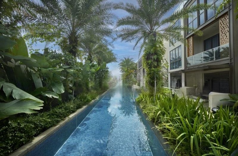 Step into a bright and airy sanctuary at PARKSUITES, where abundant natural light floods through large glass windows, illuminating the designer finishes throughout. The modern architectural façade, complemented by pitched roof elements and timber-look screens, creates an inviting ambiance that seamlessly blends with the lush greenery and stunning views of the city skyline and private lap pool.