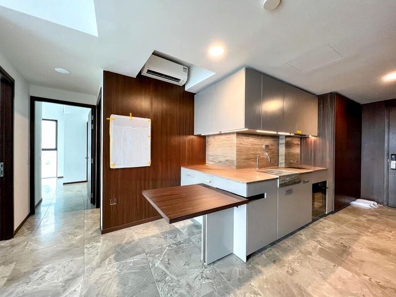This thoughtfully designed 2-bedroom unit features a spacious living room that seamlessly connects to the balcony, perfect for entertaining or unwinding. The bathroom boasts luxurious stone-look tiles, a rain shower, and a stylish stone vessel sink with a wooden vanity, elevating your daily routine. Built-in sliding wardrobes in the bedroom provide ample storage while maintaining a sleek aesthetic, complemented by wall-mounted air conditioning for year-round comfort.