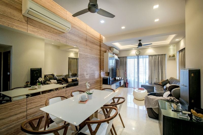 Step into a bright and airy sanctuary at The Parc Condominium, where abundant natural light floods the spacious living areas, creating an inviting atmosphere. The modern high-rise architecture and pristine white facade provide a stunning backdrop, while views of the lush greenery and the sparkling pool enhance the serene ambiance.