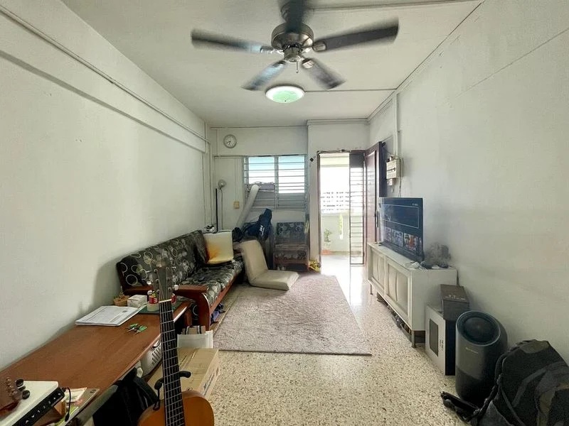 Step into a warm and inviting ambiance where classic terrazzo flooring greets you, complemented by ceiling fans that create a breezy living space. Natural light filters through the windows, offering a glimpse of urban views and access to a cozy balcony, perfect for unwinding after a long day.