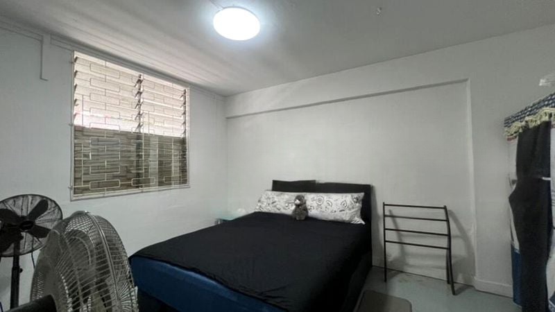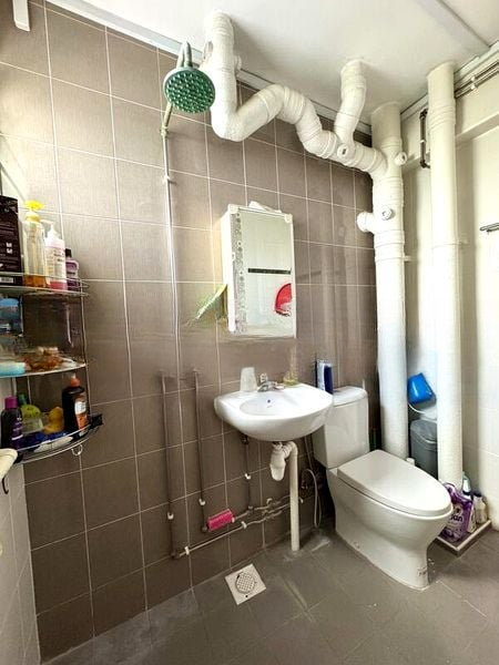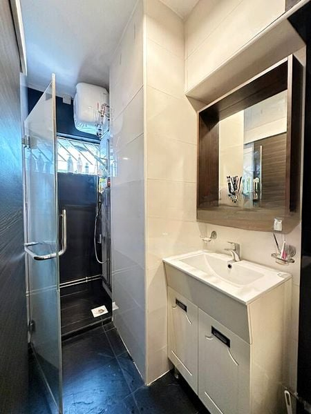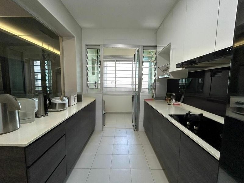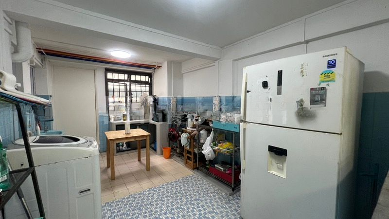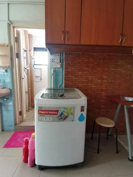 Step into this inviting 2-bedroom HDB flat, where the charm of original finishes meets a lived-in ambiance. The moderate natural light filters through the windows, highlighting the wooden cabinetry in the kitchen and the unique brick-patterned backsplash that adds character to the space. You'll feel at home with the cozy atmosphere created by the decorative elements, including a wall-mounted clock that serves as a focal point in the living area.
