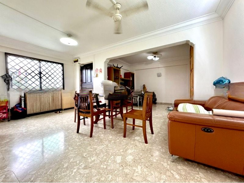 Step into a bright and airy sanctuary where abundant natural light floods the spacious living and dining areas, accentuating the classic terrazzo flooring that adds a timeless charm. The sliding glass doors lead you to a generous balcony, framed by diamond-patterned security grilles, offering serene views of lush greenery and a nearby basketball court, creating a tranquil retreat right at home.