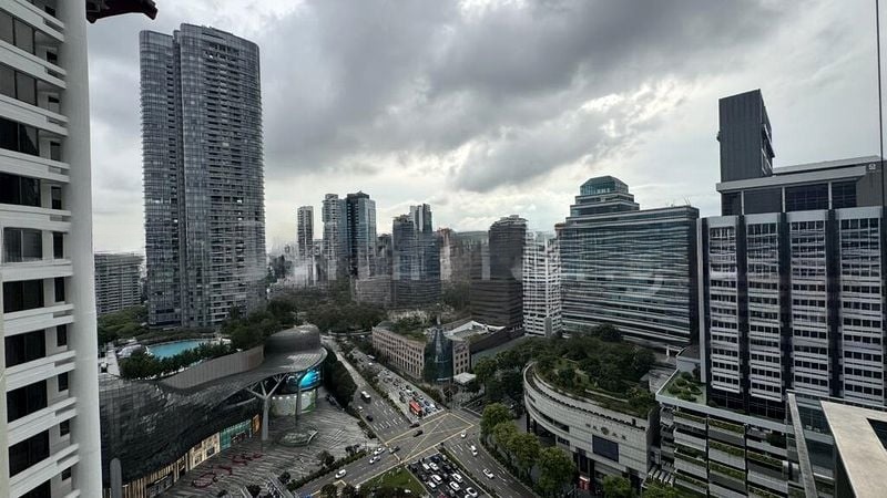 Step into a world of modern elegance as you enter this well-maintained 2-bedroom unit at Scotts Square. Bathed in natural light, the open-concept living area features floor-to-ceiling windows that frame breathtaking city skyline views. The minimalist design, complemented by glossy white cabinetry and a sleek black leather sectional sofa, creates an inviting ambiance perfect for both relaxation and entertaining.