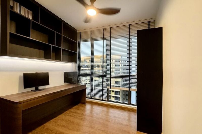 Step into a beautifully maintained unit at Hundred Palms Residences, where modern elegance meets family-friendly functionality. The foyer greets you with a large floor-to-ceiling mirror and a minimalist shoe cabinet, setting a welcoming tone. Natural light filters through the large windows, illuminating the spacious living areas adorned with tasteful finishes and a cozy ambiance.