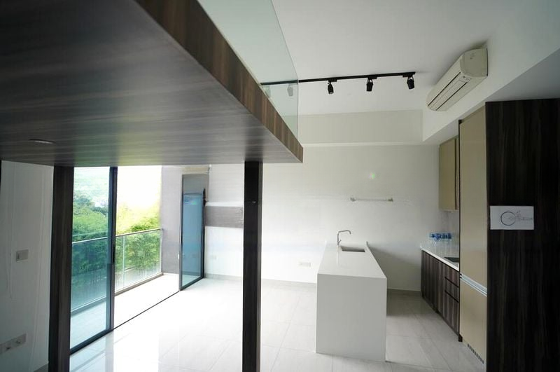 Step into a modern minimalist sanctuary at KAP Residences, where abundant natural light floods through floor-to-ceiling sliding glass doors, illuminating the open-concept living space. The sleek finishes, including dark wood-look cabinetry and a stunning white waterfall breakfast bar, create an inviting ambiance that feels both luxurious and comfortable. Enjoy serene views of lush greenery that enhance the tranquil atmosphere of your new home.