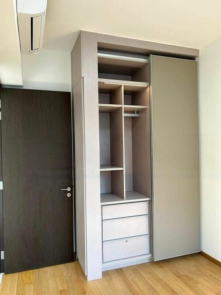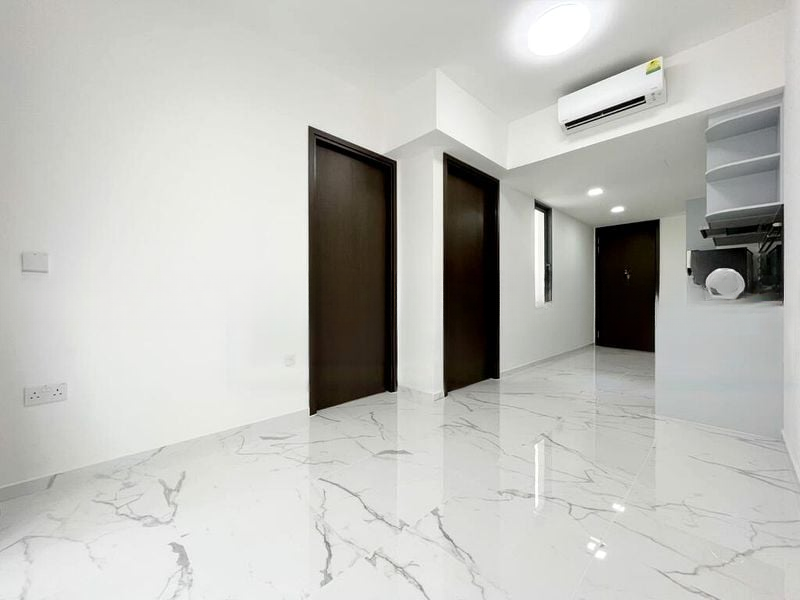 This spacious 3-bedroom, 3-bathroom unit features a well-appointed kitchen with an L-shaped layout, equipped with an Electrolux refrigerator, built-in oven, and induction hob. The bathrooms boast luxurious finishes, including a rain shower and floating vanity, while the bedrooms offer wood-look laminate flooring and double-layer curtains for privacy and comfort. With a total floor area of 920 sqft, this unit is designed for both functionality and style.