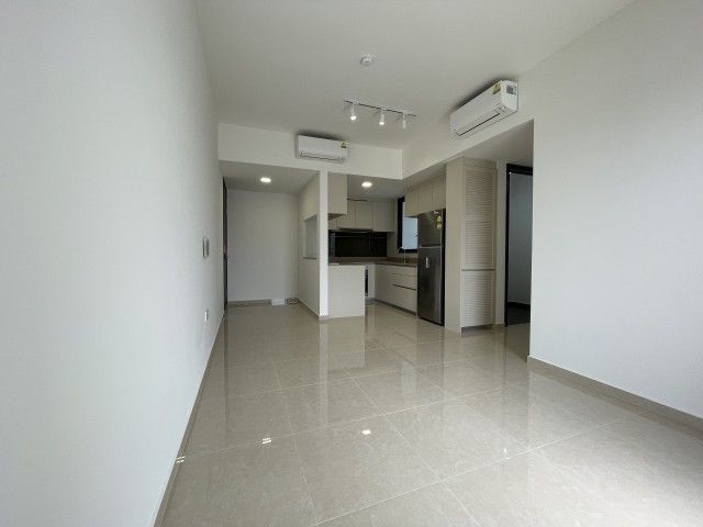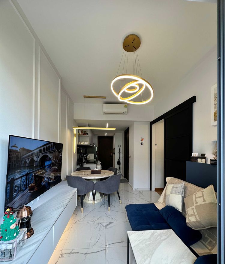 Step into a world of contemporary elegance as you enter this brand-new unit at The Gazania. The open-concept living room greets you with polished tile flooring and an abundance of natural light pouring in through floor-to-ceiling windows. The modern minimalist design, accentuated by track lighting and a ceiling fan, creates a warm and inviting ambiance, perfect for relaxation or entertaining.