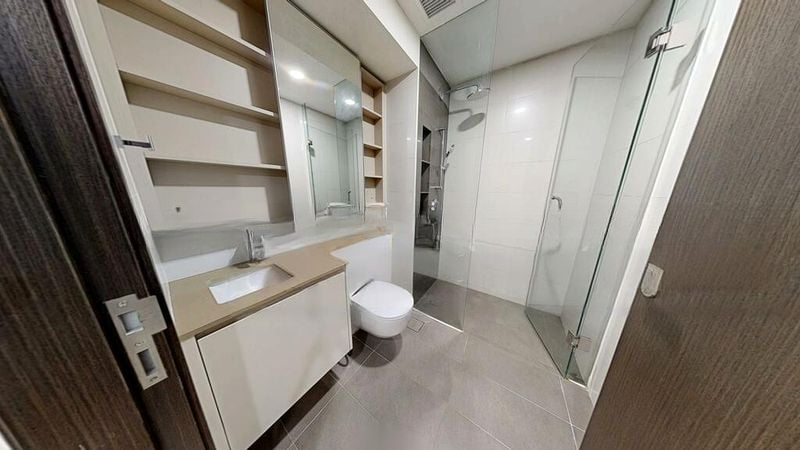 This spacious 3-bedroom, 3-bathroom unit features a well-appointed kitchen with an L-shaped layout, equipped with an Electrolux refrigerator, built-in oven, and induction hob. The bathrooms boast luxurious finishes, including a rain shower and floating vanity, while the bedrooms offer wood-look laminate flooring and double-layer curtains for privacy and comfort. With a total floor area of 920 sqft, this unit is designed for both functionality and style.