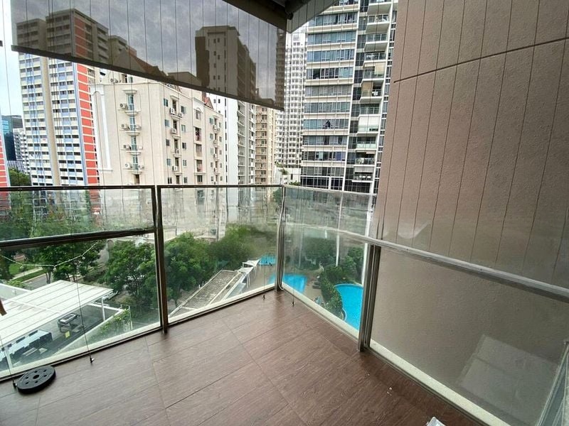 Step into a bright and airy sanctuary at Vista Residences, where abundant natural light floods the open-concept living and dining area through stunning floor-to-ceiling glass sliding doors. The spacious balcony, adorned with wood-look floor tiles and a glass railing, invites you to unwind while soaking in panoramic views of the city skyline and lush greenery.
