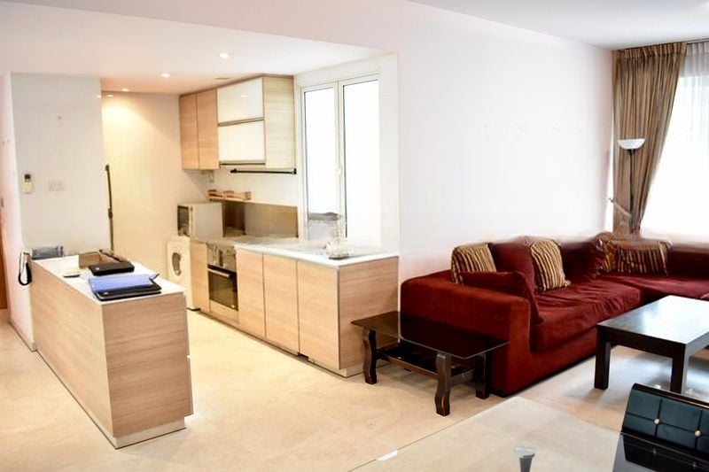 This well-maintained 1-bedroom unit features a seamless layout, perfect for both relaxation and entertaining. The fully-furnished living room flows effortlessly into a balcony with elegant wood decking, while the integrated kitchen boasts light wood cabinetry, stainless steel finishes, and top-of-the-line appliances, including an induction hob and built-in oven. The bedroom, with its wood parquet flooring and stylish pendant lighting, offers a cozy retreat, complemented by a luxurious bathroom equipped with a rain shower and mirrored vanity.
