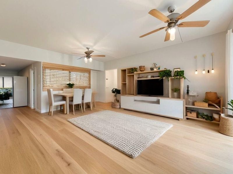 Step into this beautifully renovated 1-bedroom flat and be greeted by the warm ambiance created by the cozy terrazzo flooring and modern chandelier. The open-plan living area is bathed in natural light, enhancing the inviting atmosphere, while the gold-toned cage pendant lights add a touch of elegance. Enjoy serene views of lush greenery from your living space, making this home a tranquil retreat.