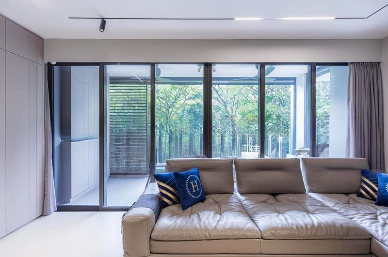 This well-maintained 5-bedroom unit boasts a spacious layout, perfect for family living. The standout kitchen is a chef's dream, featuring a large stone island with a waterfall edge, matte black cabinetry, and integrated LG appliances. Step outside to the outdoor dining balcony, complete with dual ceiling fans, where you can enjoy alfresco meals surrounded by nature. The modern minimalist finishes throughout, including track lighting and under-cabinet LED lighting, enhance the sophisticated atmosphere.