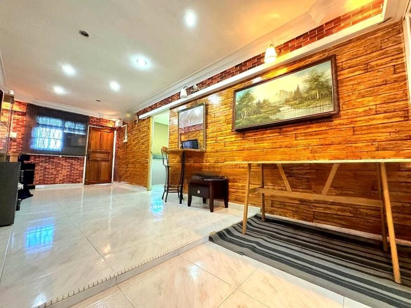 Step into a cozy haven where extensive wood-paneled walls and striking red brick feature walls create a warm ambiance that invites you to unwind. The polished tile flooring reflects natural light, enhancing the open-concept living and dining area, complete with a stylish bar-style dining setup that’s perfect for entertaining.