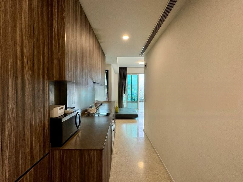 This well-maintained 1-bedroom unit features an efficient layout with a dedicated kitchen area and an en-suite bathroom. The bathroom is a standout, showcasing luxurious marble-patterned tiles and a refreshing rain shower behind a glass partition. The bedroom, adorned with full-height grey curtains and a ceiling fan, promises restful nights, while the balcony, equipped with a ceiling fan and tiled flooring, is perfect for unwinding after a long day.