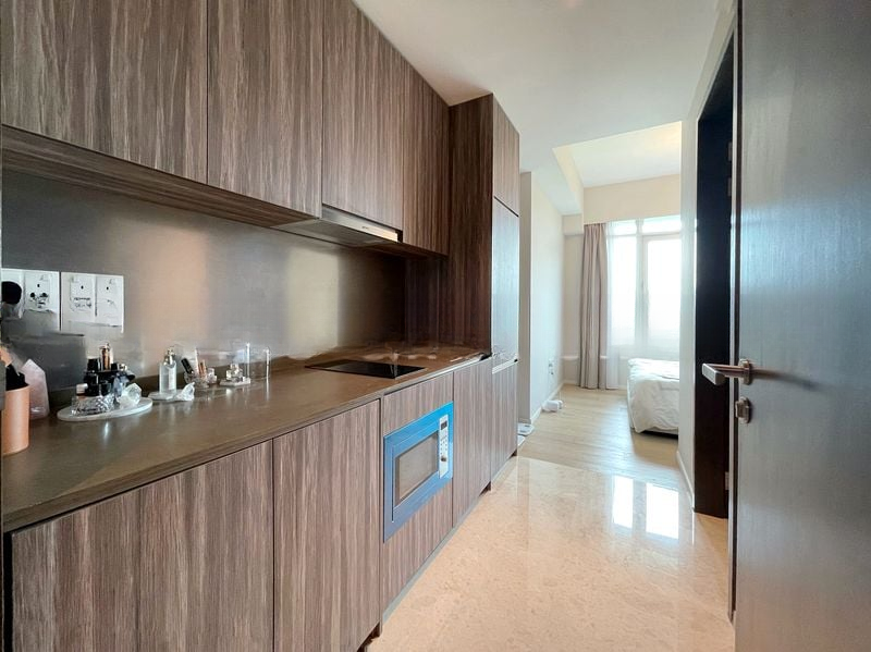Step into a sanctuary of modern elegance, where abundant natural light floods the space through floor-to-ceiling sliding glass doors. The open layout seamlessly connects the living room to a private balcony, offering stunning views of lush greenery and the city skyline. The minimalist design, complemented by light wood flooring and a custom grey wood TV console, creates a tranquil ambiance that invites relaxation.