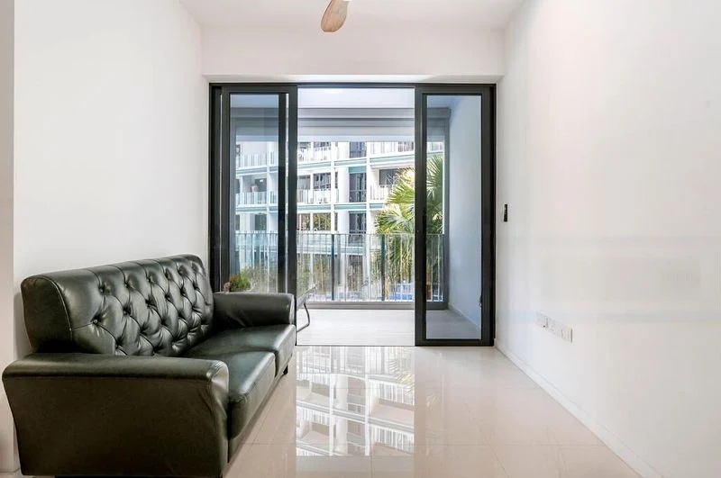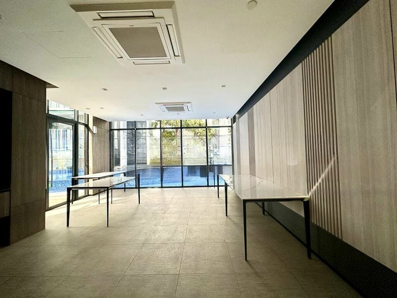 Step into a sanctuary of light and comfort at The Jovell, where abundant natural light floods the space, accentuating the polished tile flooring and the elegant finishes throughout. The living room, adorned with a sleek black leather tufted sofa, seamlessly connects to a private balcony offering serene views of the pool and lush greenery, creating an inviting ambiance that feels both refreshing and tranquil.