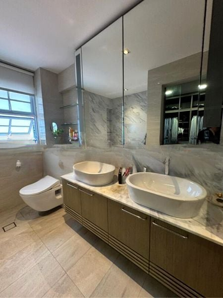 Step into a world of sophistication and warmth as you enter this stunning 5-bedroom unit at Clementi Park. The designer renovation is evident in the elegant finishes, from the floor-to-ceiling built-in bookshelves in the study to the luxurious black marble vanity countertops in the master bathroom. Natural light filters through large windows, illuminating the parquet flooring throughout, creating an inviting ambiance that feels both spacious and cozy.