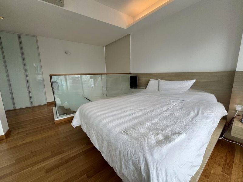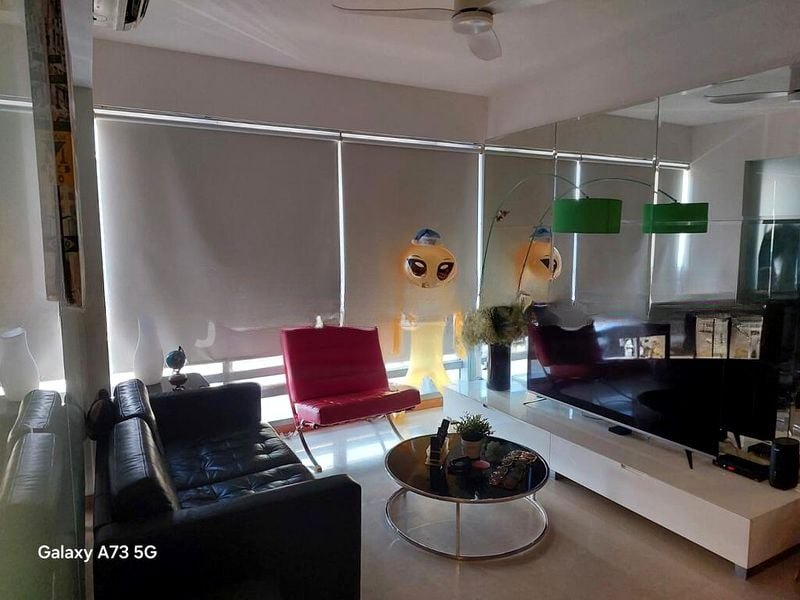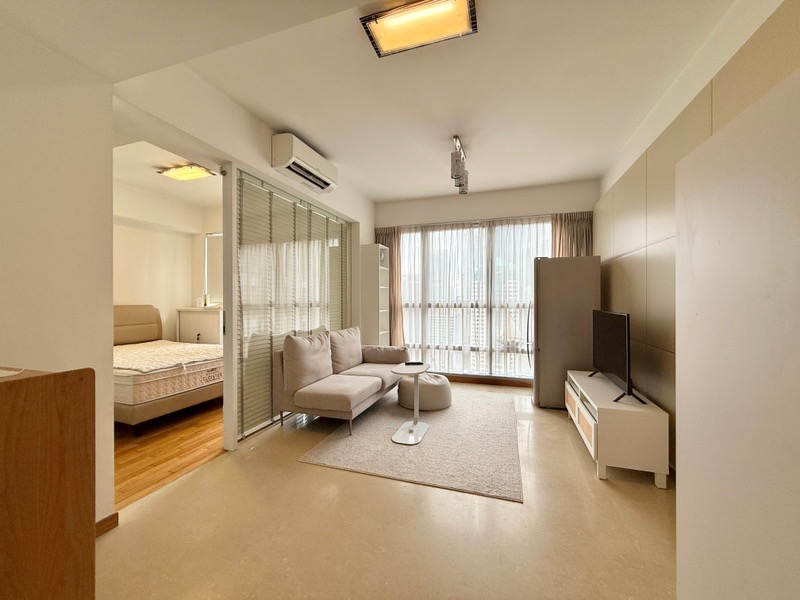 This well-maintained unit features a stylish open kitchen with wooden cabinetry and black countertops, complemented by stainless steel appliances. The cozy bedroom, adorned with wood parquet flooring, offers a tranquil retreat with a plush double bed and neutral roller blinds. Thoughtful touches like a glass partition wall and pendant lighting enhance the overall aesthetic, making this home a true gem.