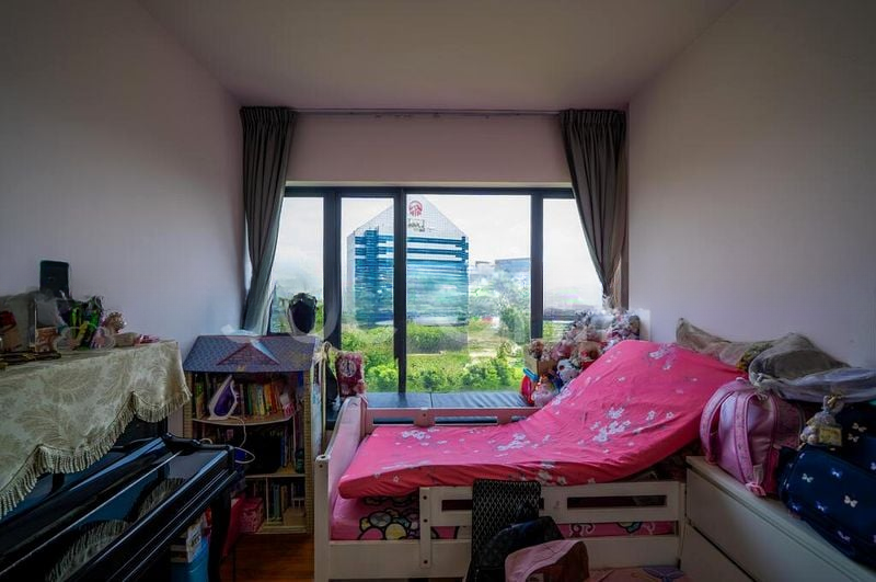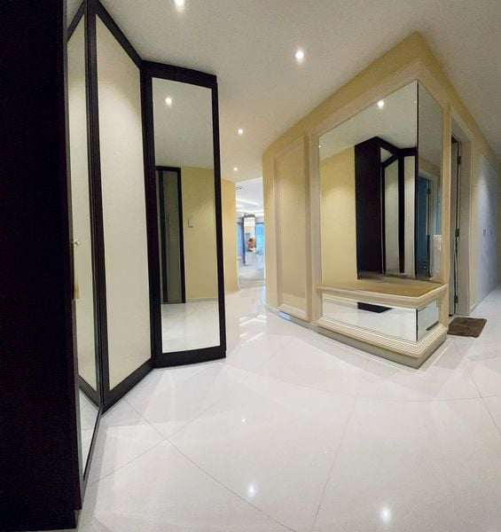 This well-maintained 3-bedroom condo features standout elements such as a concrete-effect feature wall in the dining area, a live-edge wooden dining table, and built-in mirrored wardrobes that enhance the sense of space. The modern galley kitchen, equipped with grey minimalist cabinetry and wooden countertops, is perfect for culinary enthusiasts, while the spacious living room, with floor-to-ceiling glass sliding doors, seamlessly connects to a generous balcony, ideal for relaxation.