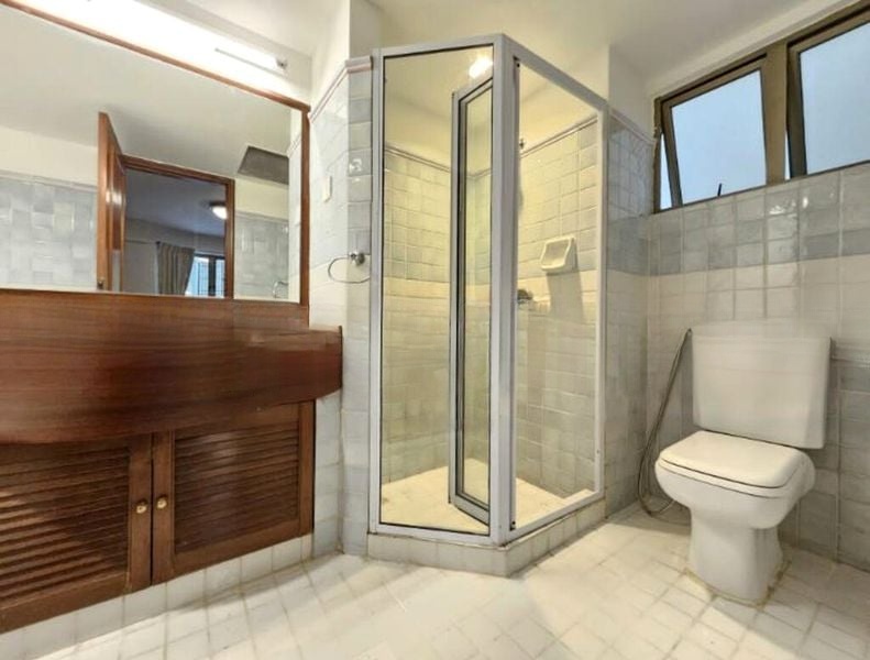 Step into a cozy haven at Cavenagh Lodge, where warm natural light dances across the marble flooring of the living room, inviting you to unwind. The large window frames a serene view of lush greenery, creating a tranquil ambiance that instantly makes you feel at home. The well-maintained unit boasts original finishes that exude character and charm, perfect for those who appreciate a touch of nostalgia.