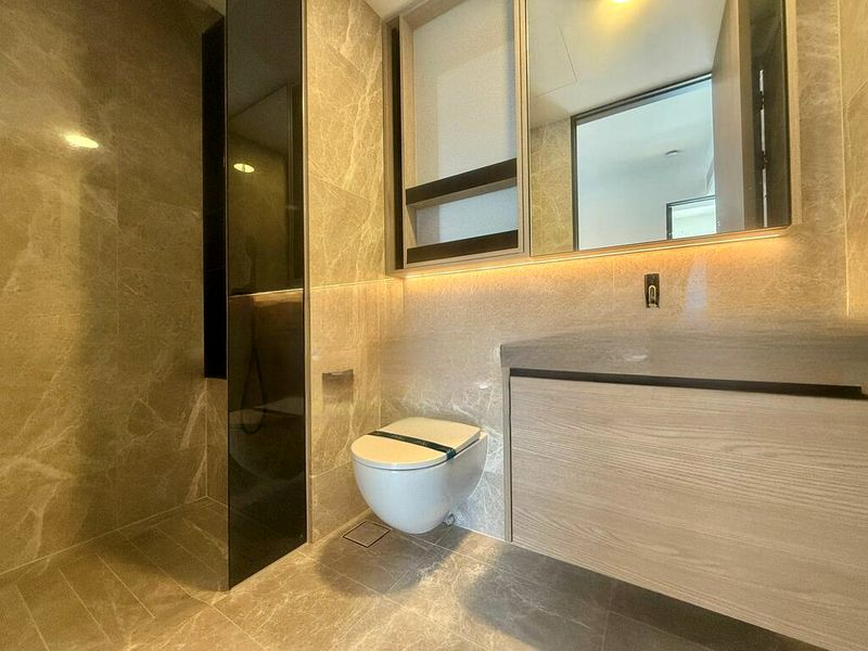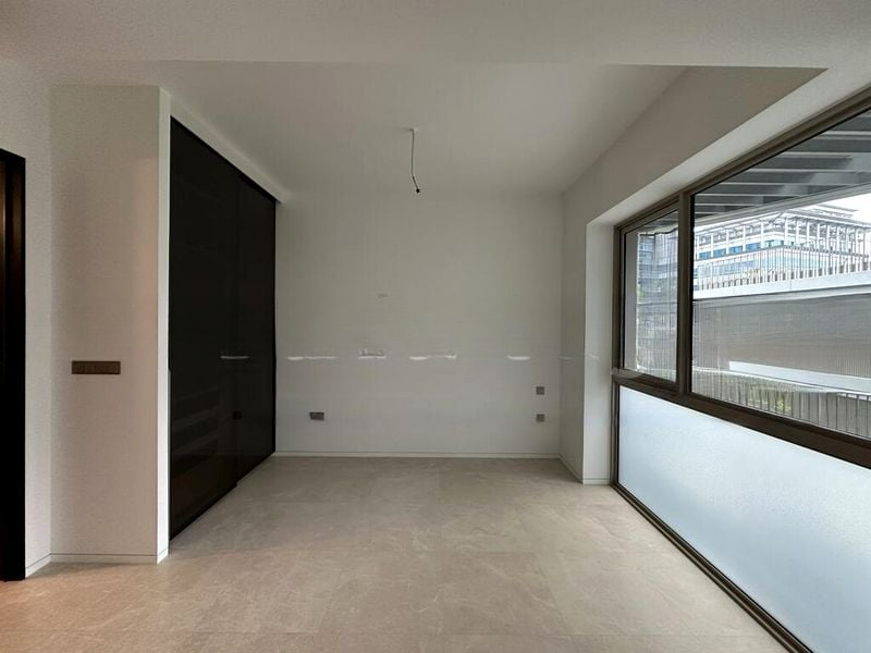 Step into a world of elegance as you enter this brand-new studio at The Reef at King's Dock. The moody ambiance is accentuated by wood-paneled walls and ceilings, complemented by integrated LED strip lighting that casts a warm glow throughout. The large L-shaped balcony invites you to enjoy the views while the marble-look flooring adds a touch of luxury to your living space.