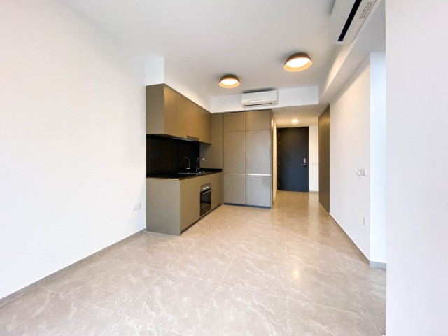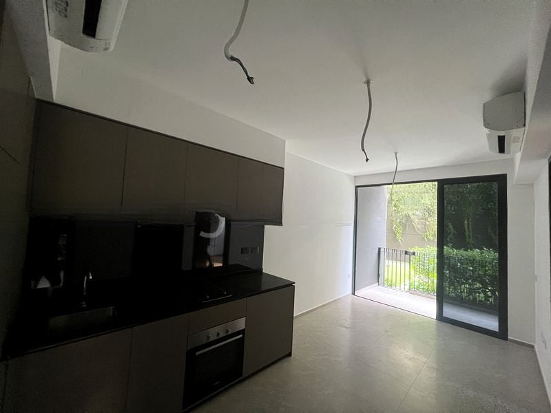 Step into a brand-new sanctuary where modern minimalism meets serene greenery. The floor-to-ceiling windows bathe the living area in natural light, creating an inviting ambiance that flows seamlessly onto your private balcony, perfect for morning coffees or evening relaxation. The sleek finishes, including large format floor tiles and dark grey cabinetry, enhance the contemporary feel of this exquisite unit.