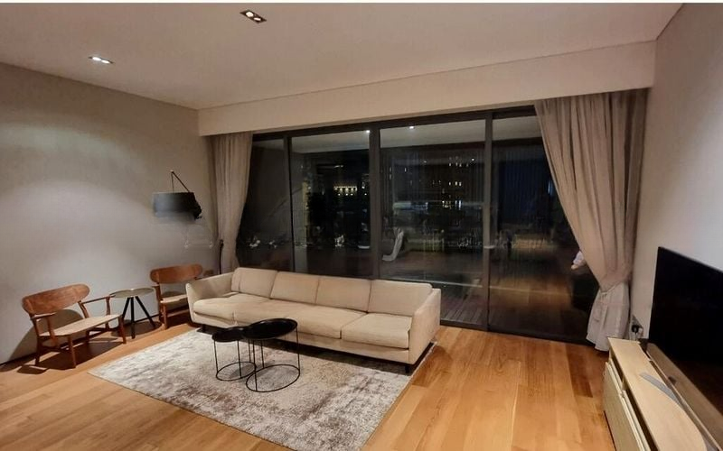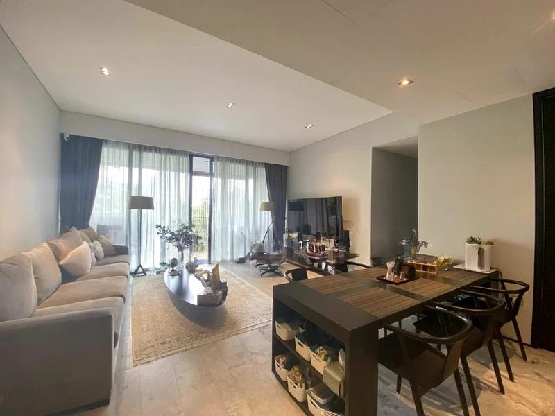 Step into a world of modern elegance as you enter this beautifully renovated unit at OUE Twin Peaks. Bathed in abundant natural light, the open living area features floor-to-ceiling windows that frame breathtaking views of the city skyline and lush greenery. The minimalist design is complemented by high-end finishes, including designer pendant lighting and a striking striped area rug, creating an inviting ambiance that feels both luxurious and serene.