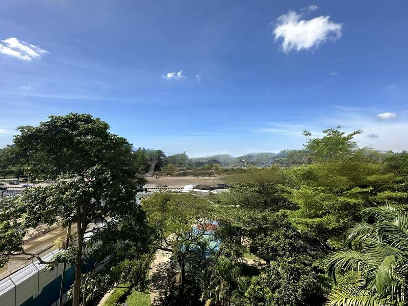 The layout features three well-proportioned bedrooms, each with the same luxurious marble flooring and large windows that frame views of the surrounding greenery. The unfurnished unit offers a blank canvas for your personal touch, allowing you to transform this dated space into your dream home. With two bathrooms, there’s ample convenience for family living.