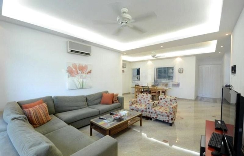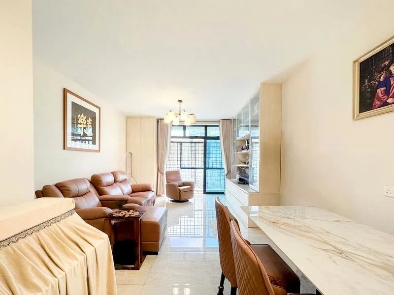 This well-maintained 3-bedroom condominium features an open-concept layout that seamlessly connects the living and dining areas. The living room boasts an L-shaped sofa and floral accent armchairs, while the dining area is adorned with a stylish wooden dining set and a convenient serving hatch to the kitchen. The kitchen is a chef's dream, equipped with granite countertops, frosted glass cabinets, a built-in oven, and a gas hob, ensuring both functionality and style.