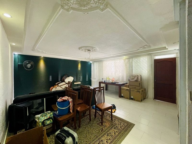 Step into this inviting 4-room HDB unit and feel the warmth of its original charm. The living room greets you with decorative ceiling molding and a striking dark green accent wall, complemented by moderate natural light filtering through the window grilles. The tiled flooring adds a touch of practicality, making it a cozy space for gatherings.