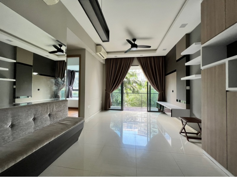 Step into this beautifully renovated unit at The Palette, where modern minimalist design meets abundant natural light. The polished tile flooring and large windows create a bright and airy ambiance, complemented by views of neighboring greenery. The inviting balcony, adorned with timber decking, beckons for outdoor relaxation and dining.