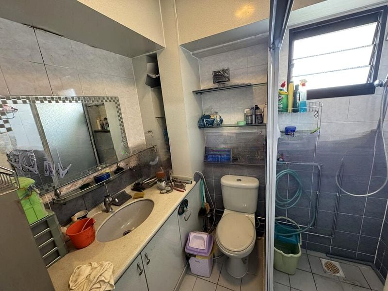 This efficient 3-bedroom, 2-bathroom layout features a dedicated entrance foyer leading to a spacious living area, a stylish dining space with a 4-seater set, and a galley kitchen equipped with integrated appliances. The master bedroom boasts a built-in sliding wardrobe and an en-suite bathroom, while the two additional bedrooms are perfect for study or rest, each adorned with textured wallpaper and large windows that invite in light.